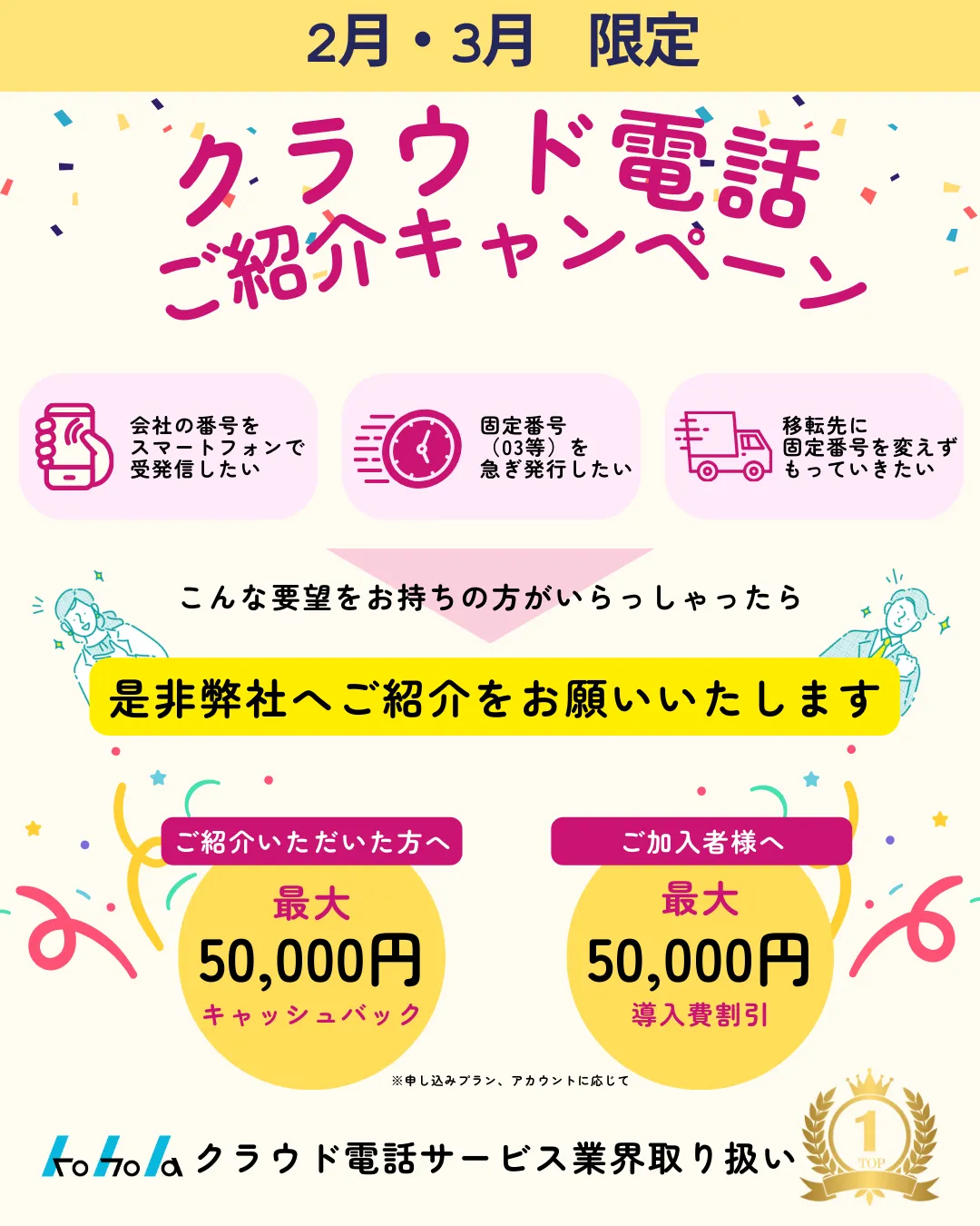 株式会社koholaは、2025年の2月から3月の限定期間中、特別な「クラウド電話ご紹介キャンペーン」を実施しています。このキャンペーンでは、紹介者と導入者の双方に最大50,000円の特典を提供するという、非常にお得な内容です。