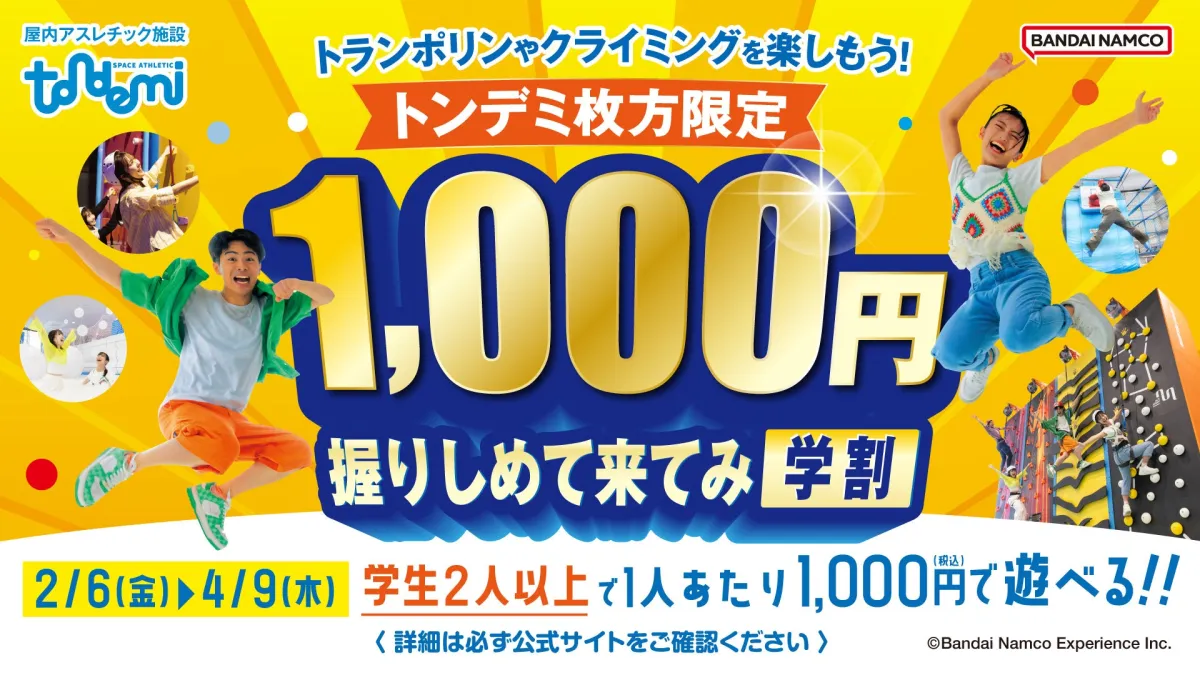 2026年の2月6日から3月19日まで、屋内アスレチック施設『トンデミ枚方』では「1,000円握りしめて来てみ学割」が実施されます。これは、中学生から大学生まで、さらに専門学生や短大生も対象という、学生にぴったりのキャンペーンです。2人以上での利用が必須で、トンデミを1人あたり1,000円という低価格で楽しむことができるという特典があります。