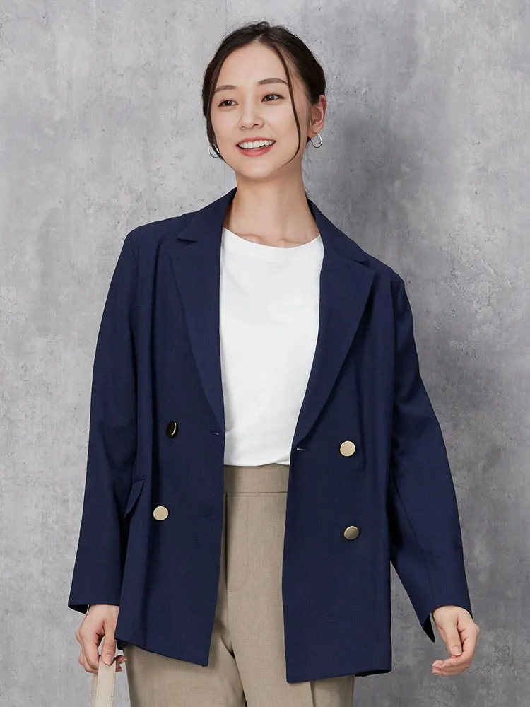 このジャケットは、選べるネイビーとオフホワイトの2色がラインナップされており、ビジネスシーンやカジュアルな外出時に幅広く活用できます。また、トレンドを意識したメタルボタンを組み合わせることで、シンプルながらもセンスのよいスタイルに仕上がっています。さらっとした風合いとリラックスシルエットのおかげで、身体の動きに自由さを与え、気軽に羽織れる点が嬉しいポイントです。
