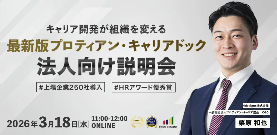 講師として登壇するのは、4designs株式会社と一般社団法人プロティアン・キャリア協会のCGO、栗原和也氏です。彼は外資系IT企業でのシステムエンジニアとして経験を積み、その後人事部門で新卒採用に関与。キャリア開発や組織開発支援に精通しています。
