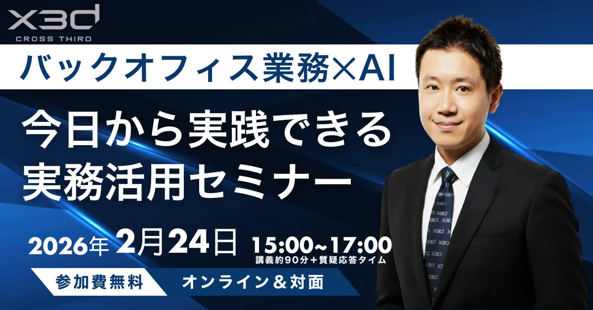 このような背景を受け、x3d株式会社(本社:東京都港区)は、2026年2月24日(火)にバックオフィス業務の効率化をテーマにしたAI実務活用セミナーを開催することが決定しました。本セミナーは、全国どこからでもオンラインで参加可能で、札幌の会場では対面でも参加できます。