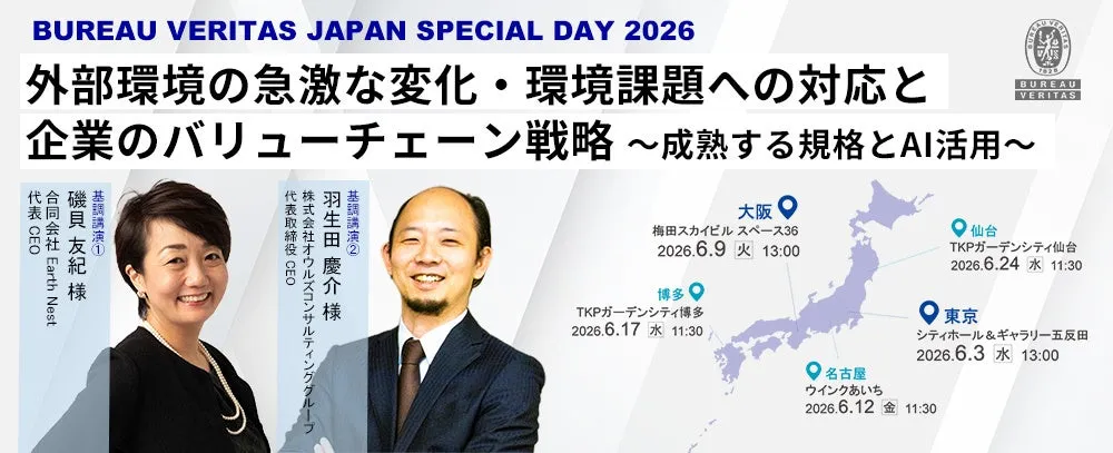 2026年6月、ビューローベリタスジャパン株式会社が主催する「BUREAU VERITAS JAPAN SPECIAL DAY 2026」が、東京、大阪、名古屋、博多、仙台の全国5都市で開催されます。本イベントは、急激な外部環境の変化に対処するための企業戦略としてのサステナビリティ経営、そして2026年に改訂されるISO 9001およびISO 14001の重要性について議論します。