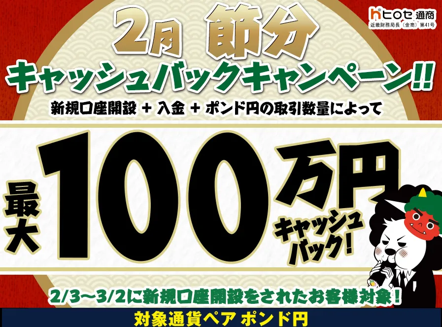 ヒロセ通商株式会社が運営する「LION FX」は、2025年の節分に合わせ新たに「2月節分最大100万円キャッシュバックキャンペーン」を開始しました。このキャンペーンは、新規口座を開設した方々を対象に、ポンド円の取引量に応じて最大100万円がキャッシュバックされるというものです。
