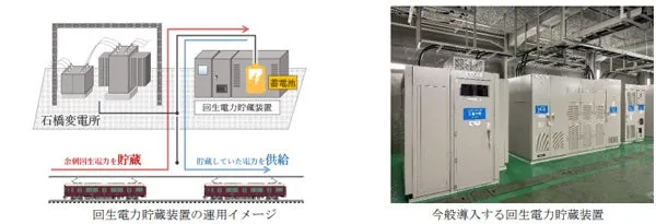 回生電力とは、電車が減速する際に発生する運動エネルギーを電気エネルギーに変換したもので、他の電車の運行に再利用されます。しかし、同時に多くの車両が減速する場面では余剰の回生電力が生じ、再利用されずに失われることが多くあります。この状況を改善するために設置されるのが、今回の「回生電力貯蔵装置」です。