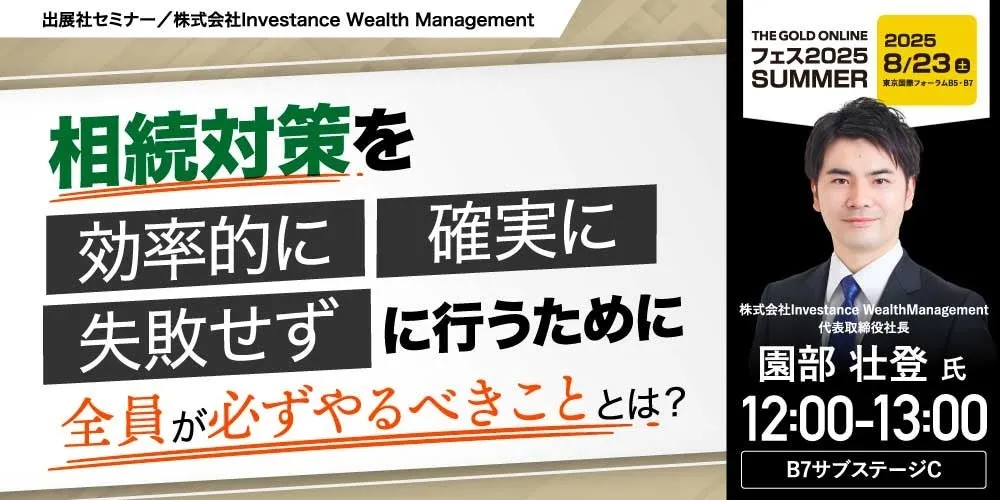 2025年8月23日(土)、東京国際フォーラムにて「THE GOLD ONLINE フェス 2025 SUMMER」が開催される。その中で、株式会社Investance Wealth Managementの園部壮登氏が登壇し、「相続対策を“効率的に”“確実に”“失敗せず”に行うために全員が必ずやるべきこととは?」というテーマでセミナーを行う。相続対策は誰にとっても重要な問題であり、円満な相続を実現するためには正しい知識と計画が必要だ。