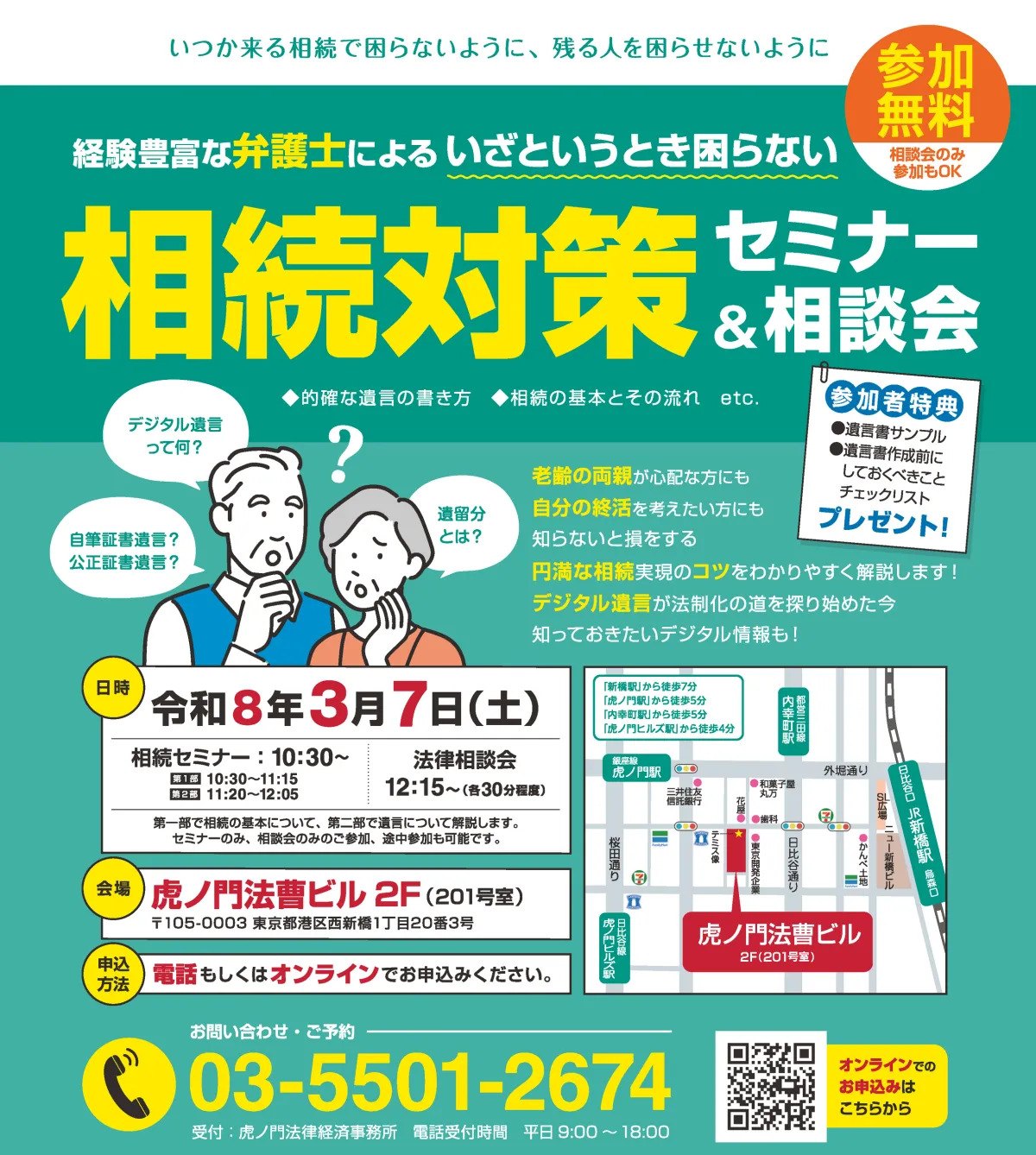 2026年3月7日、東京の虎ノ門で、相続対策に特化した無料セミナーが開催されます。このセミナーでは、経験豊富な弁護士が相続の基礎知識から具体的な対策まで、詳しく解説します。相続がいつやってくるかわからない今こそ、必要な準備を始める絶好の機会です。