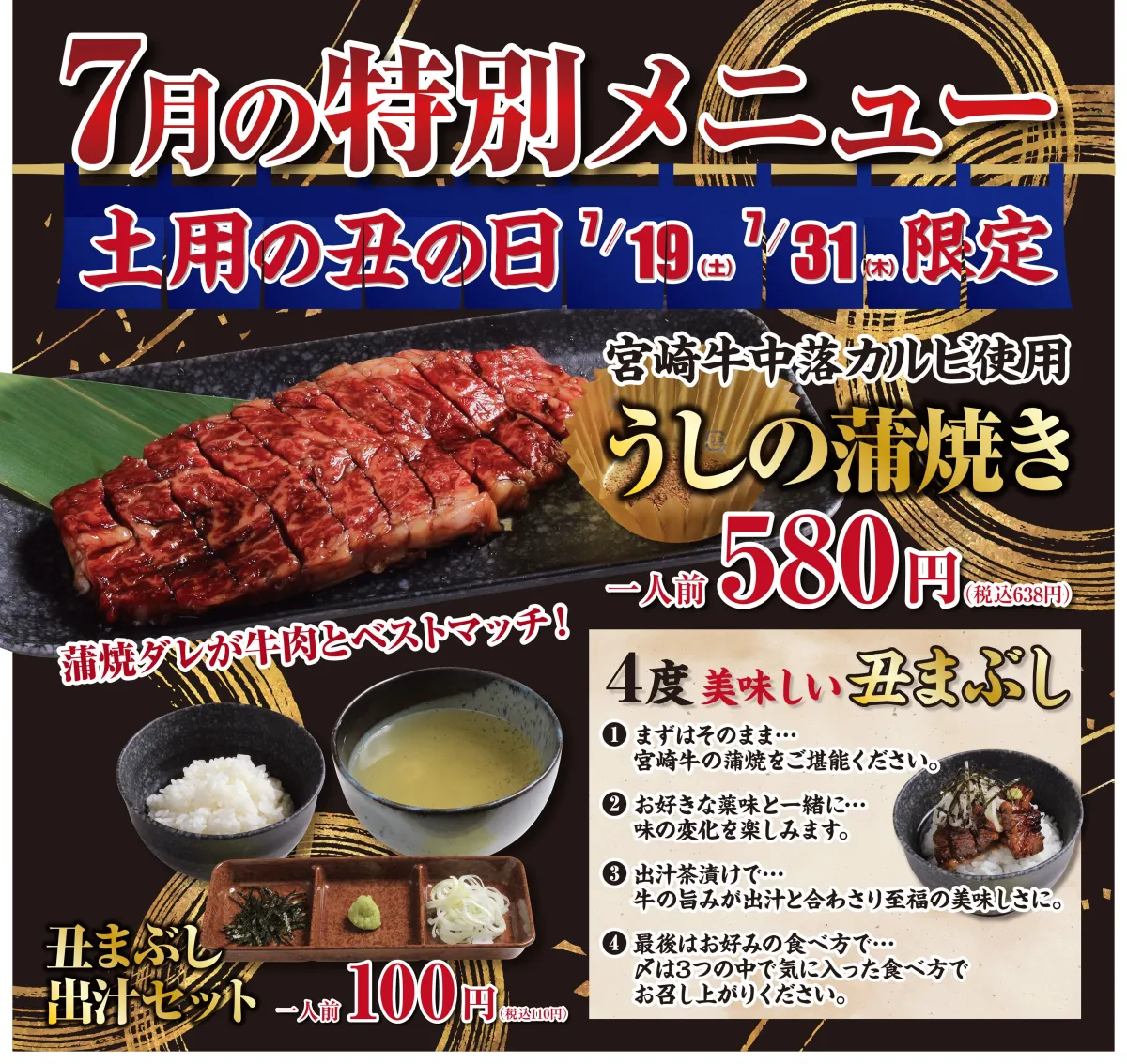 今年の土用の丑は、あみやき亭による独自の楽しみ方が登場します!7月19日(土)と7月31日(木)の特別な日には、なんと「宮崎牛中落カルビ」を使用した【うしの蒲焼き】が味わえます。この料理は特製の蒲焼きタレで香ばしく仕上げられており、1人前580円(税込638円)で提供される予定です。さらに、蒲焼きとの相性を考慮して、【丑まぶし出汁セット】も用意されており、こちらは100円(税込110円)で追加購入可能です。