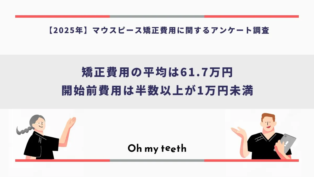 株式会社Oh my teethが実施した最新の調査によると、マウスピース矯正の平均費用は約61.7万円ということがわかりました。この調査は、直近5年以内にマウスピース矯正を経験した133名を対象に行われました。