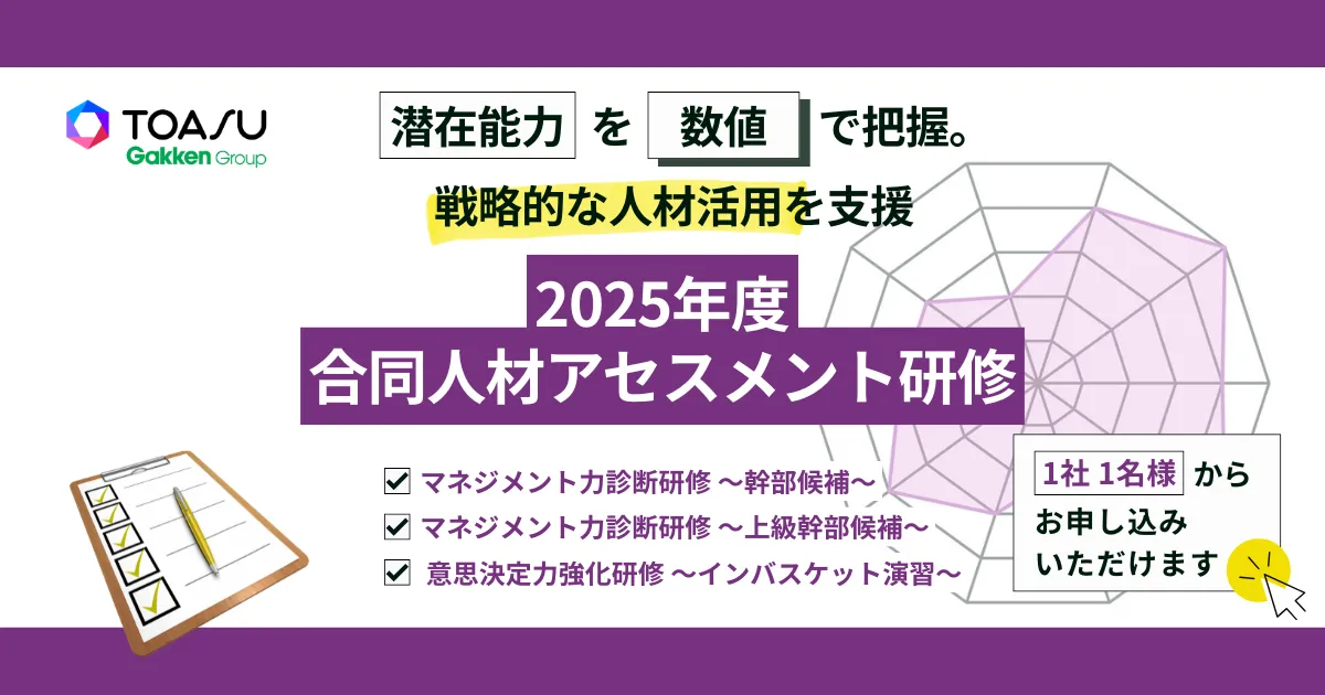 株式会社TOASUが提供する2025年度の人材アセスメント研修は、次世代のリーダーを育成するために設計されています。研修の趣旨は、企業の競争力を高めるために、まず人材力を強化することにあります。急速に変化するビジネス環境に対応できるリーダーは、現在の企業にとっての最重要テーマとなっています。