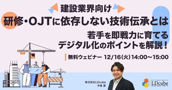 建設業界における若手育成は、今や企業の存続に直結する重要な課題です。株式会社LDcubeは、2025年12月16日14:00から、特にこの問題にスポットをあてたウェビナーを開催します。今回のテーマは「研修・OJTに依存しない技術伝承」で、デジタル化を通じた若手を即戦力に育成する方法を解説します。
