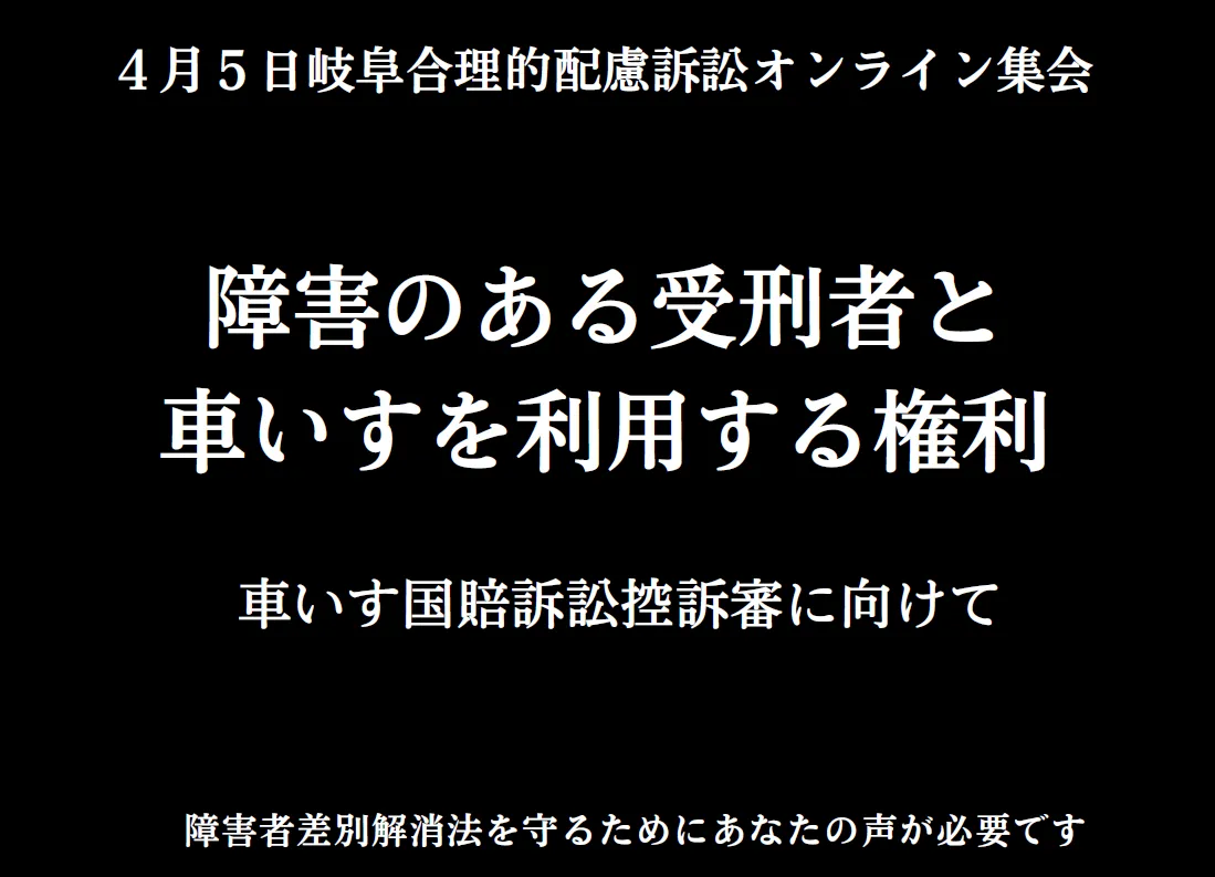 岐阜地方裁判所は、2024年10月30日、歩行困難な受刑者への合理的配慮を無視し、原告敗訴の判決を下した。この判決は、障害者差別解消法の趣旨に反するものであり、今後の司法判断にも重大な影響を与える可能性がある。こうした背景を考慮に入れ、参加者は意見交換を行い、事件の適正な審理と公正な判決を求める声をあげる必要がある。