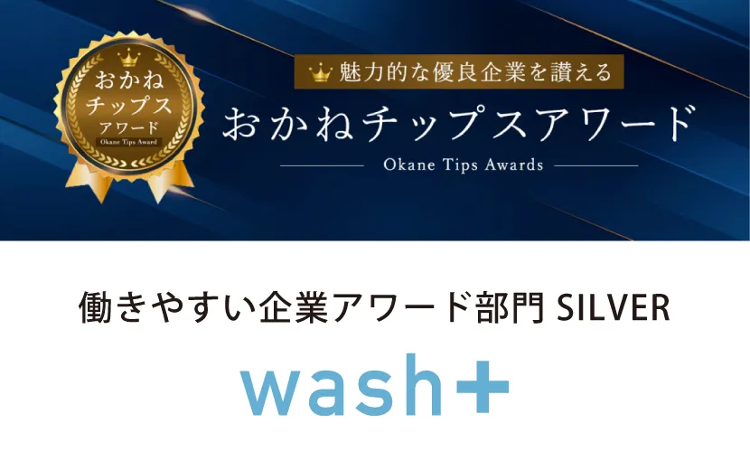 wash-plusは、最近実施された「おかねチップスアワード」の「働きやすい企業アワード部門」でSILVERに認定されました。このアワードは、企業の魅力だけでなく、社員の働きやすさ、企業文化、福利厚生、職場環境などを包括的に評価するもので、年次や役職に関わらず率直な意見を言える企業として認められたことは、wash-plusの強みと言えるでしょう。