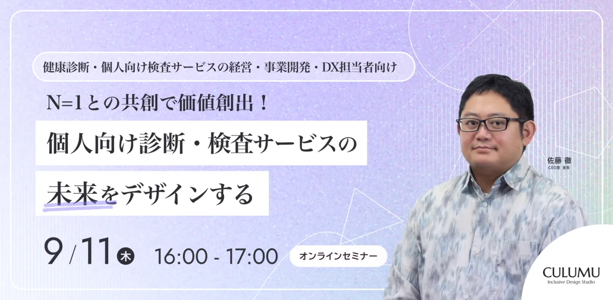 2023年9月11日、株式会社STYZが主催するオンラインセミナーが開催されます。「N=1との共創で価値創出! 個人向け診断・検査サービスの未来をデザインする」というテーマで行われ、このセミナーでは、個人向け健康診断や検査サービスが抱える課題とそれに対する解決策が提示されます。