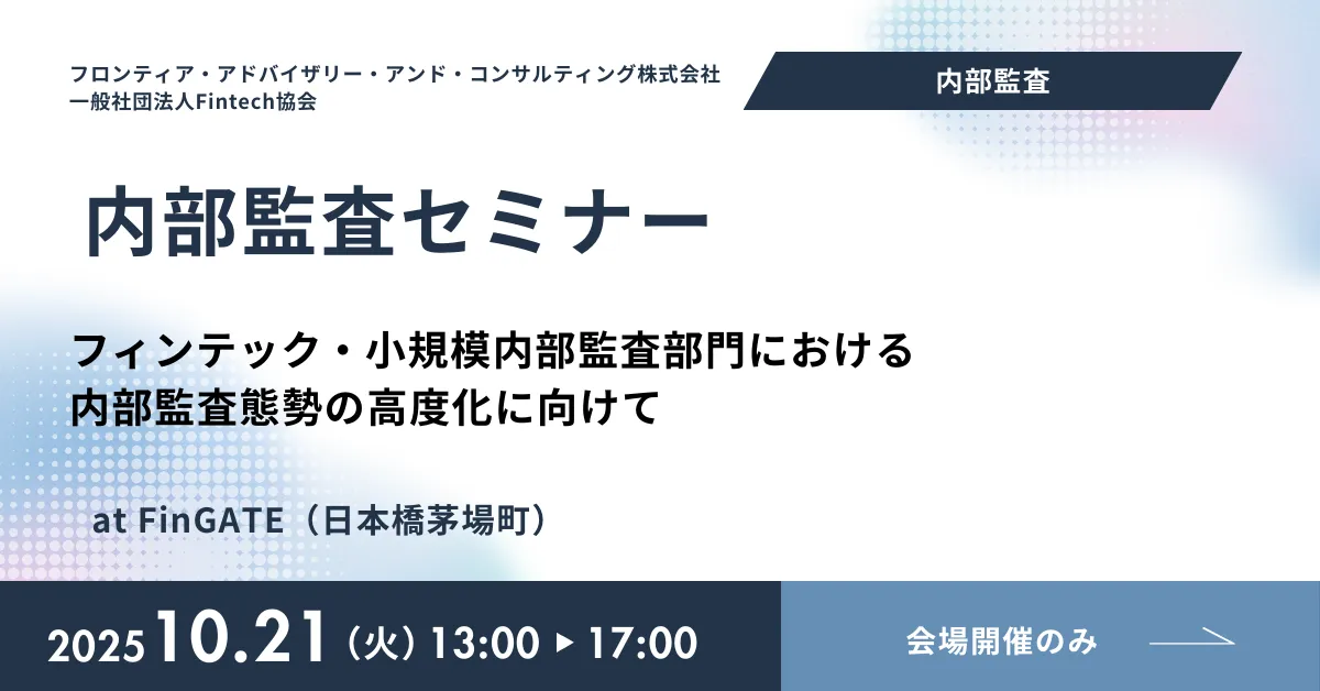 2025年10月21日(火)、一般社団法人Fintech協会とフロンティア・アドバイザリー・アンド・コンサルティング株式会社が共催する内部監査セミナーが開催されます。近年、フィンテック業界における内部監査の重要性が増しており、限られたリソースでの効果的な監査態勢の構築が多くの企業に求められています。このセミナーでは、業界の専門家が集まり、内部監査に関する実務と課題について議論します。