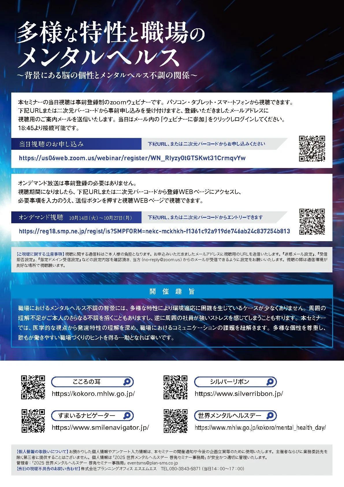 2025年10月10日(金)、大塚製薬主催の「2025 世界メンタルヘルスデー啓発セミナー」が開催されます。このセミナーは、職場におけるメンタルヘルスの重要性を考え、多様な特性を持つ人々がどのように環境に適応できるかについての理解を深めることを目的としています。セミナーは7時から開始され、Zoomを活用してリアルタイムで配信されるほか、後日オンデマンド視聴も可能です。