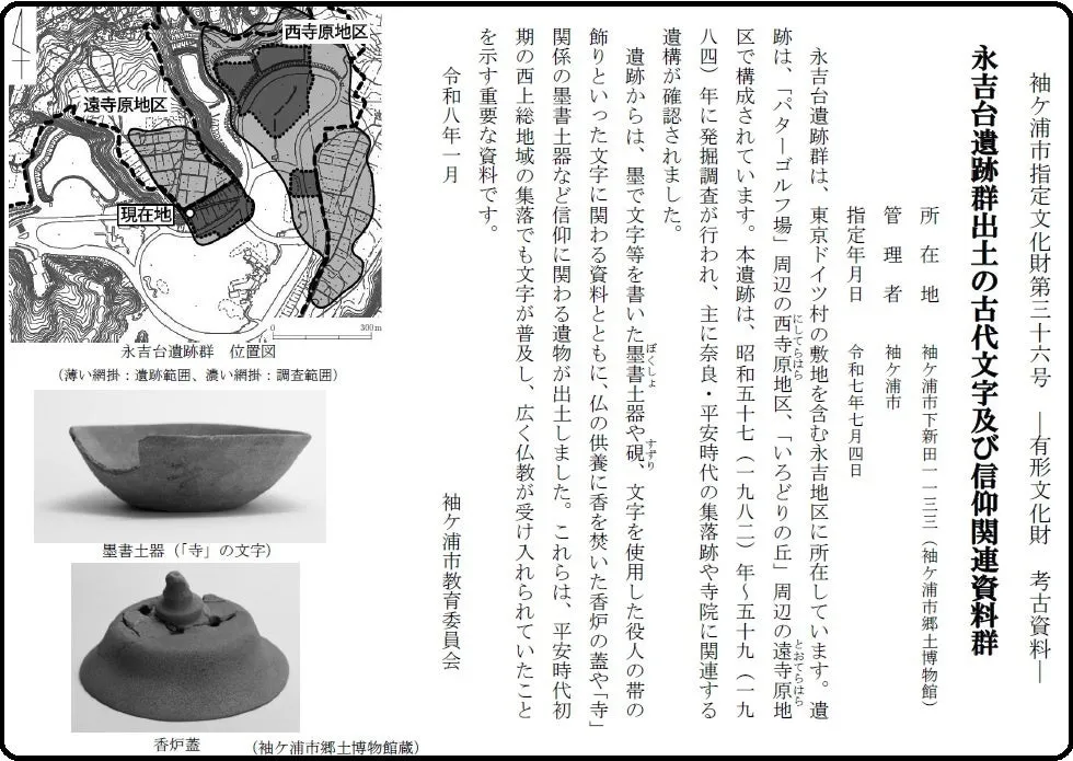 令和7年7月4日、袖ケ浦市は「永吉台遺跡群出土の古代文字及び信仰関連資料群」を市指定文化財に認定しました。これに伴い、東京ドイツ村の協力を得て、解説看板が設置されました。この看板は、古代の貴重な資料を広く知らしめることを目的にしています。