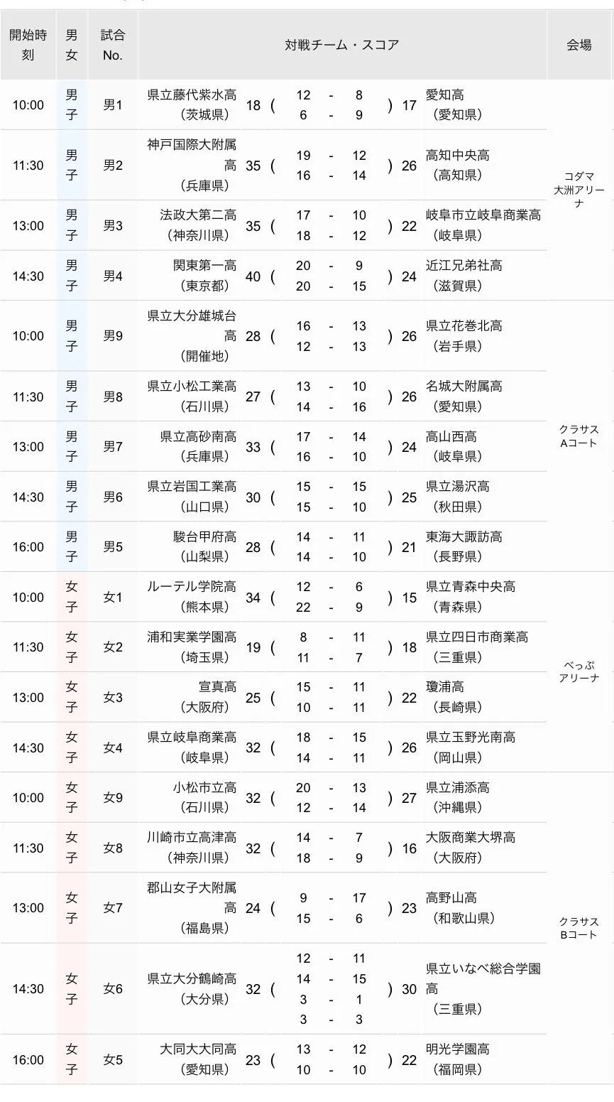 大会は3月24日から29日までの6日間行われ、開催場所はサイクルショップコダマ大洲アリーナ、クラサス武道スポーツセンター、そして別府市総合体育館(べっぷアリーナ)や大分舞鶴高校の多目的競技場など、多岐にわたります。