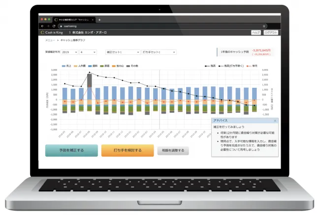 経営者とのやり取りを通じて入力された数値が、即座に未来のキャッシュフローのグラフとして現れます。これにより、迅速な判断が可能になります。
