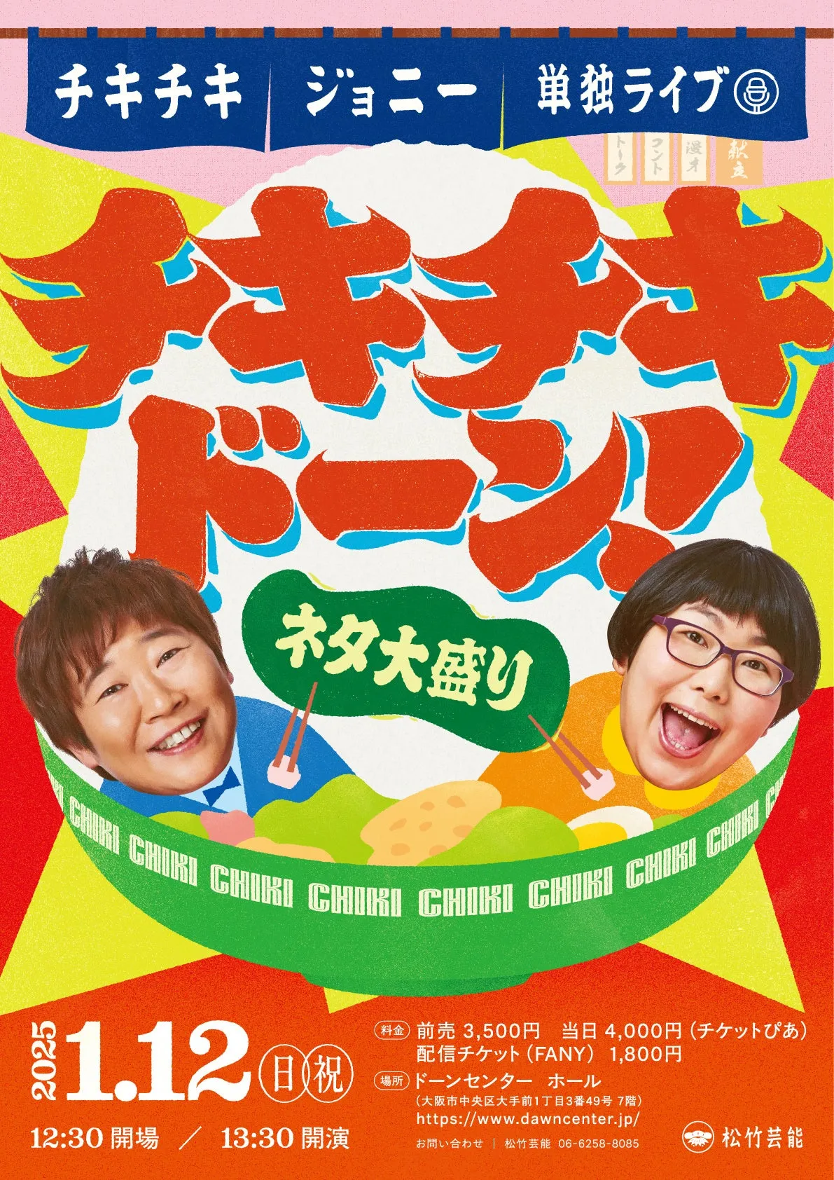 2025年1月12日(日・祝)に大阪市中央区にあるドーンセンターホールで行われるこのライブは、チキチキジョニーの持ちネタをたっぷり楽しめる内容となっている。