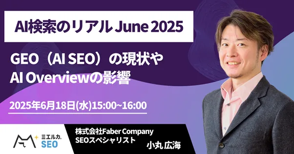 株式会社Faber Companyが2025年6月18日(水)に、「AI検索のリアル June 2025 ~GEO(AI SEO)の現状やAI Overviewの影響~」というタイトルの無料ウェビナーを開催します。このウェビナーでは、AI検索の最新動向や、AI SEO(GEO)に関する重要な情報を提供します。