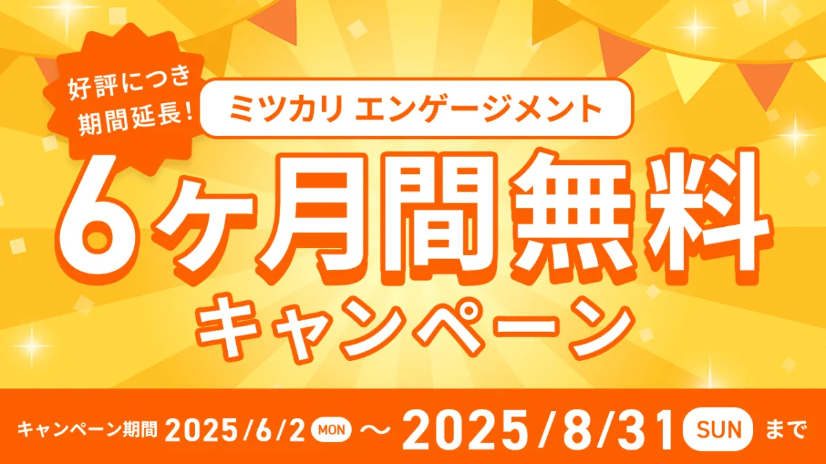 株式会社ミツカリ(東京都渋谷区、代表取締役社長CEO:表 孝憲)は、従業員のエンゲージメントを可視化するオンラインツール「ミツカリエンゲージメント」の6ヶ月間無料キャンペーンを2024年8月31日まで延長することを発表しました。このキャンペーンは、対象期間中に新たに相談を行った企業が、そのサービスを初期費用や利用料無く利用できる機会を提供するものです。