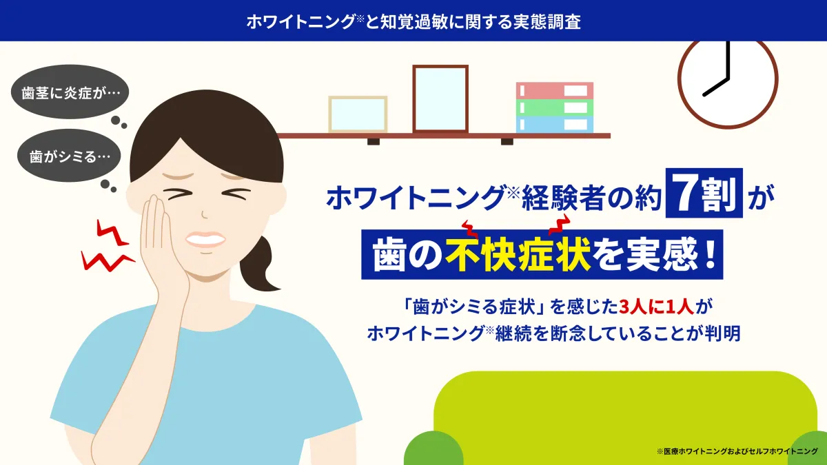 中でも、「歯がシミる」といった知覚過敏の症状に苦しむ人が多いことがわかりました。具体的には、ホワイトニングを受けた人の約45.3%がこのシミる症状を経験し、そのうち約3人に1人はその痛みを理由にホワイトニングを続けることを断念しているという結果が出ました。これは、美しい白い歯を手に入れることへの意欲を阻む大きな障壁となっています。