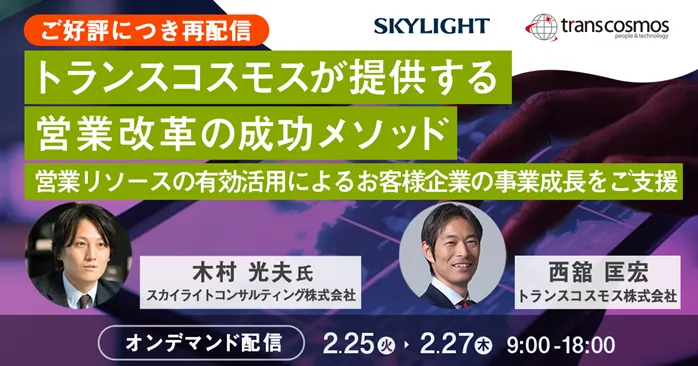 トランスコスモスのオンラインセミナーは、2025年2月25日(火)から2月27日(木)の3日間にわたり開催されます。これは「営業改革の成功メソッド」をテーマにしたセミナーで、特に営業リソースの有効活用を通じて、お客様企業の事業成長を支援する内容となっています。