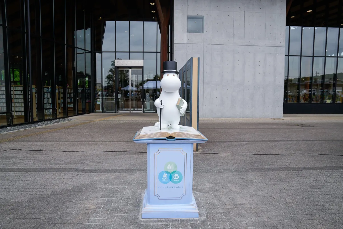 ムーミンパパオブジェは、高さ約78cmのFRP製で、台座の高さは約95cm。デザインは本をモチーフにしており、まるで物語の中からムーミンパパが飛び出してきたかのような印象を与えます。このオブジェは、読書の楽しさや想像力を育むシンボルとして、訪れる皆さまを温かく迎え入れます。