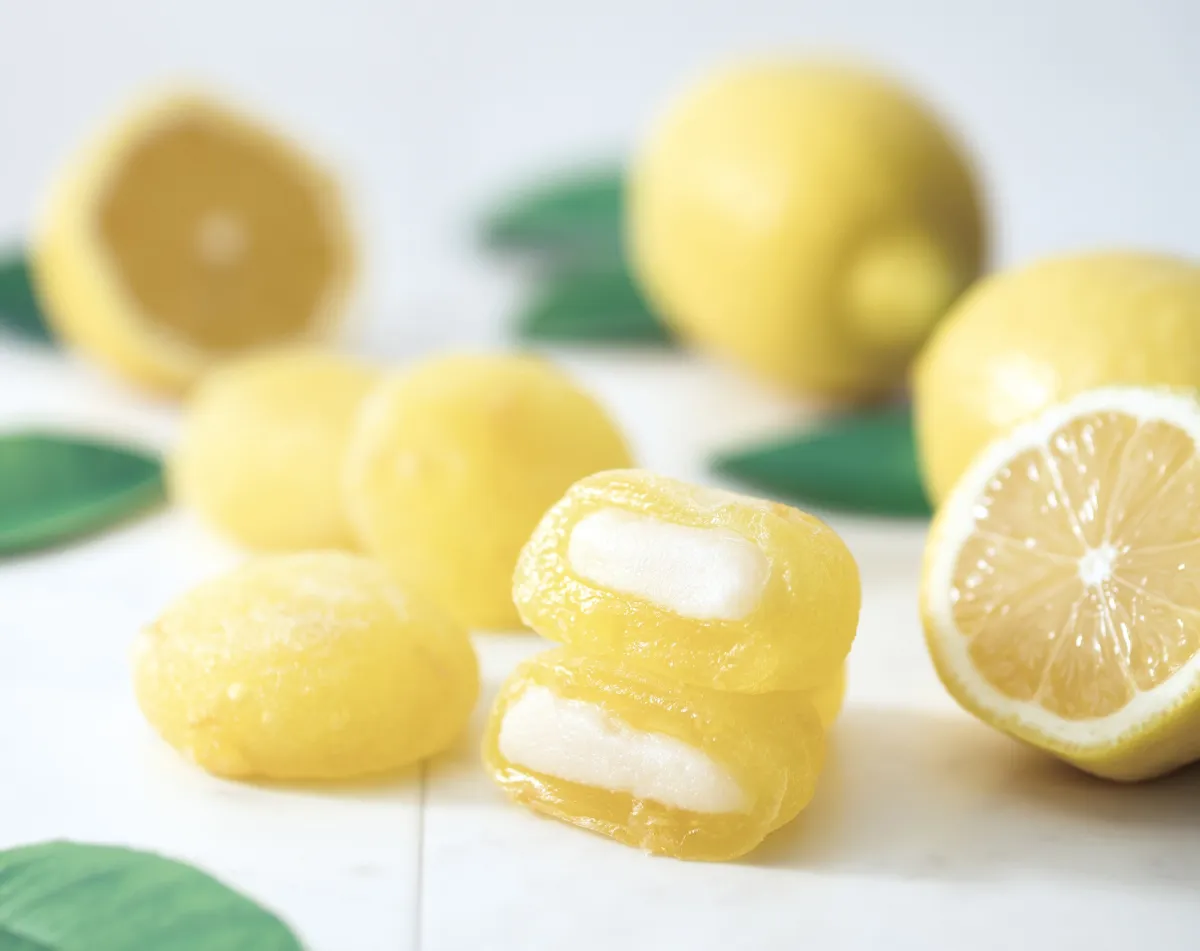 この和菓子の生地は、和菓子の定番素材である葛を使っており、ぷるぷるとした瑞々しい食感が特徴的です。レモンの皮の砂糖漬けが練り込まれ、口に含むとほどよい酸味と香りが広がります。さらに餡にはミルクをたっぷり入れた特製のミルクあんを使用し、レモンの酸っぱさと甘さが絶妙に絡み合います。