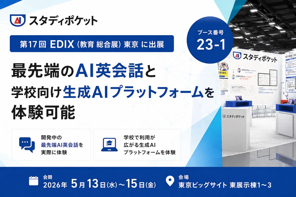 スタディポケット株式会社は、2026年5月13日から15日まで東京ビッグサイトで開催される教育分野の最大級展示会「第17回 EDIX(教育 総合展)東京」に出展します。開催場所である東京ビッグサイトの東展示棟に位置するブース(小間番号:23-1)では、最新のAI英会話製品や、生成AIプラットフォーム「スタディポケット」の実演が行われます。