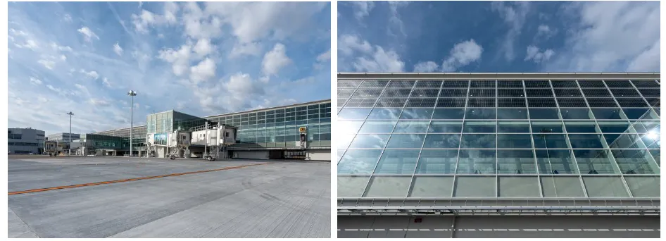 本施設では、設置スペースが限られた空港敷地においても最大限の発電効率を狙うため、建材と一体化した太陽光発電ガラス「サンジュール®」が使用されています。この革新的な技術により、空港における持続可能な発電が実現し、CO2の排出削減にも貢献しています。