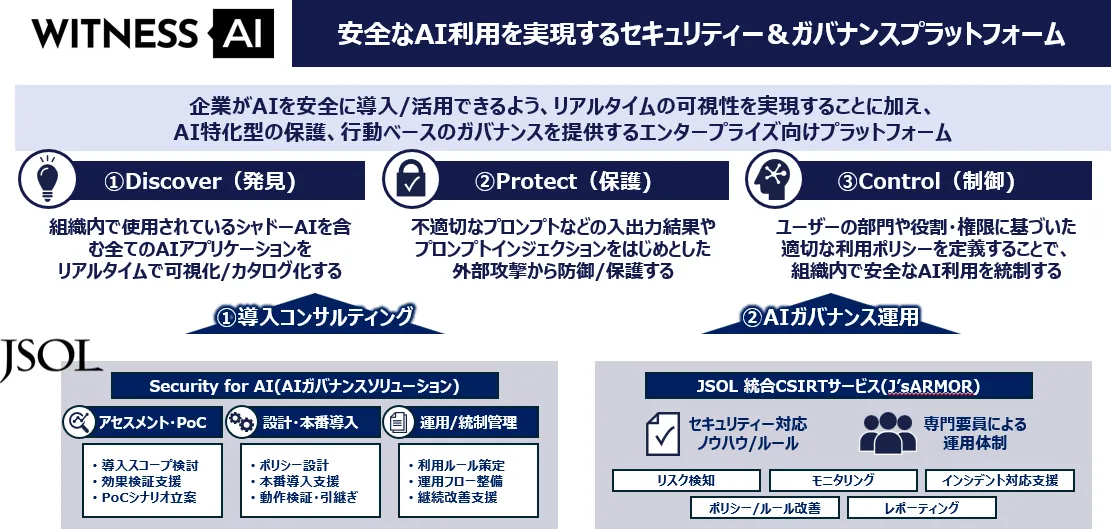WitnessAIのプラットフォームは、生成AIやAIエージェントの利用によるリスクを実務的に対処するためのツールです。これにはプロンプトインジェクションのような新たな脅威から企業を保護する機能が含まれています。JSOLは、自社開発の統合CSIRTサービス「J’s ARMOR™」と連携させることで、実効性の高いAI統制を実現します。