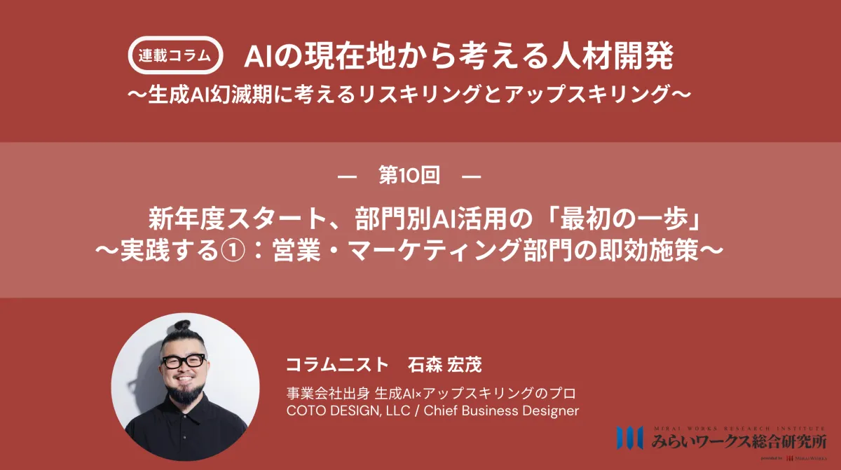 AIの進化に伴う変化に企業がどのように対応すべきか、その戦略が具体的に描かれている本連載は、大企業の経営層や人材開発部門の責任者にとって必見の内容です。みらいワークス総合研究所が提供する情報は、特に今後のビジネスシーンにおけるAI活用と人材育成の重要な指針となるでしょう。これからのフェーズで企業はさらなる成長の機会を見出すことが期待されます。