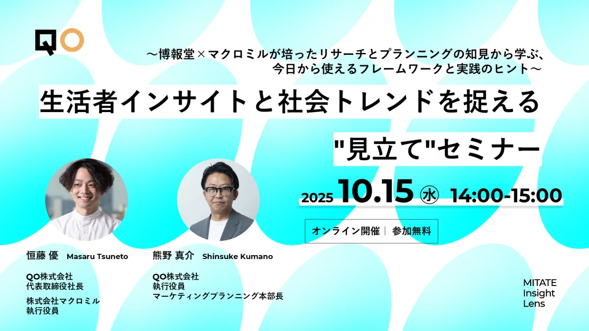 リサーチとプランニングを行うQO株式会社(代表:恒藤優)は、2025年10月15日(水)14:00より、生活者インサイトと社会トレンドを活用したマーケティングセミナーをオンラインで開催します。このセミナーでは、消費者の選好を理解し、商品やサービスを効果的に提供するための具体的な手法が紹介されます。