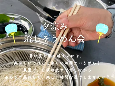 流しそうめんは、参加者がそれぞれの具材を流しながら楽しむ伝統的なスタイルで、日中の暑さを忘れさせてくれる涼やかなひとときです。このイベントでは、参加者が自ら育てた野菜やハーブを使い、この場ならではの特別な味わいを楽しみました。すいかやミニトマト、ミント、ローズマリーなど、皆で育てた作物を活用することで、参加者の盛り上がりもひとしおで、収穫祭への期待も高まります。