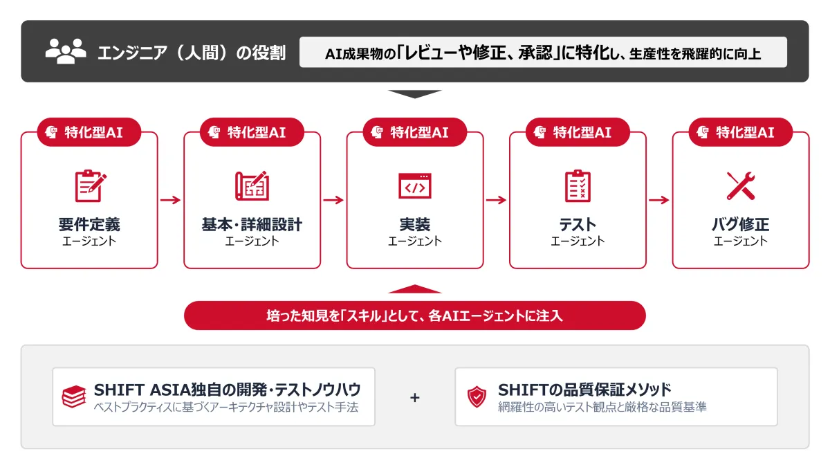 SHIFT ASIAは、このサービスを通じて、ソフトウェア開発におけるあらゆる工程にAIを活用します。従来の開発方式では、プロジェクトの要件定義から設計・実装・テストに至るまで、人間が中心となって進めていきます。しかし、AI駆動開発では、複数のAIエージェントがそれぞれ特定の役割を果たし、連携しながら開発を進めていく仕組みになっています。このため、人間の手がほとんど介入せず、効率的かつ高品質な成果物が作り出されます。