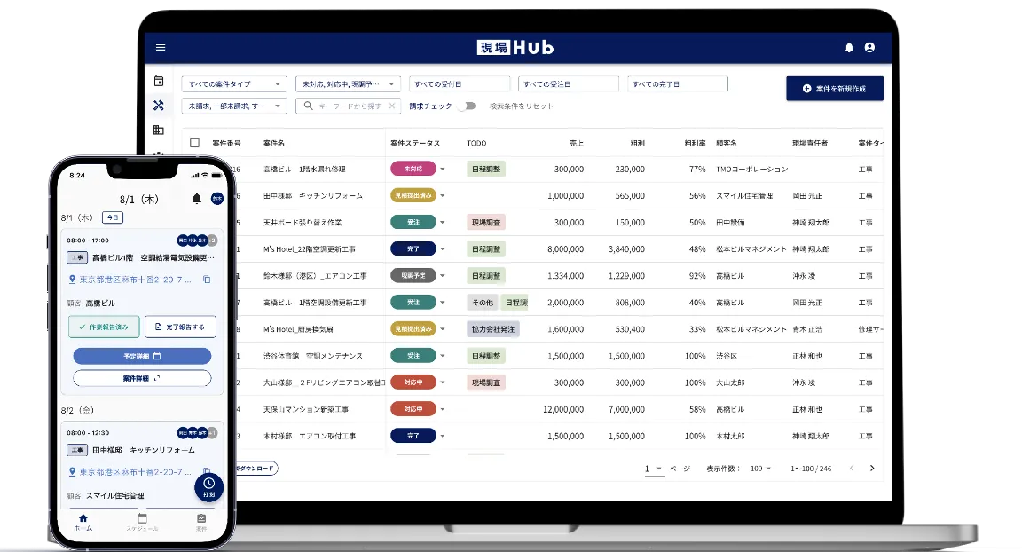 現場Hubは、案件の進捗や写真、報告などの情報を一元管理するクラウド型システムです。PCやスマートフォンで直感的に操作することができ、ITに不慣れな方や高齢者にも優しい設計です。日常業務の効率性を高めるとともに、蓄積された現場情報を活用することでスピード感のある顧客対応が可能になり、売上向上にも繋がります。