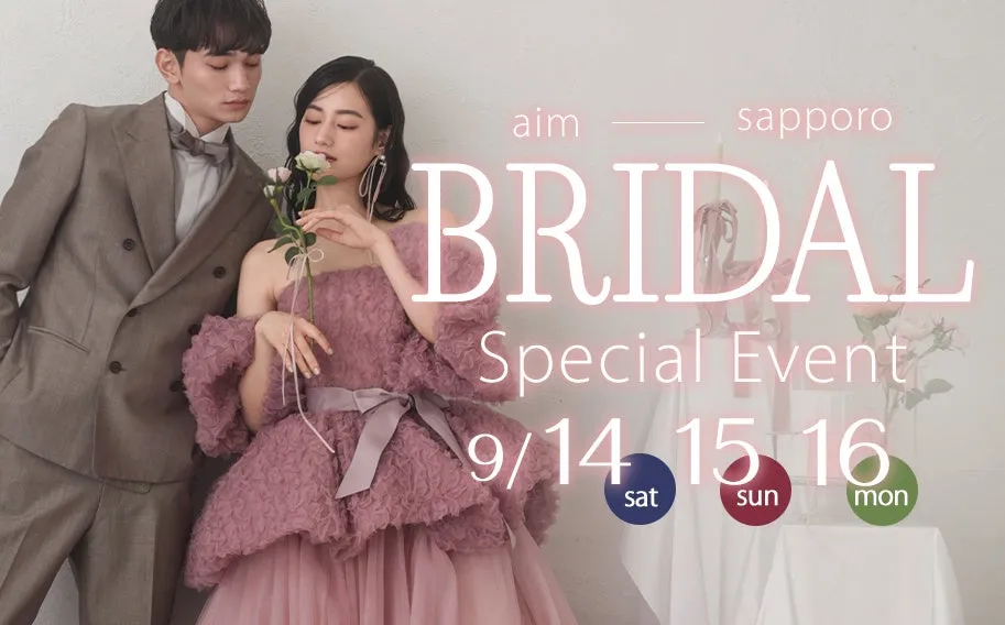 2024年9月14日から16日の3日間、aim札幌店にて新作衣装の披露と無料試着ができる体験型ブライダルフェアを開催します。このイベントは、顧客からの多くの問い合わせを受けたトレンドコレクションを中心に、注目の新作ドレスを一堂に揃える特別な機会です。