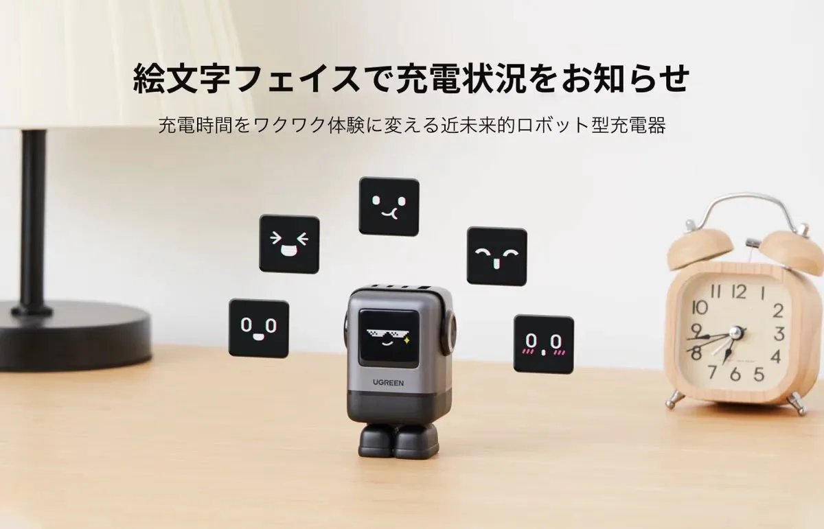 UGREEN Unoの一番の特徴は、その遊び心溢れるデザインです。前面にはTFTスクリーンが搭載されており、充電状況に応じてロボットの表情が変わります。充電中は「頬を膨らませた顔」、通常時は「ちょっと照れた顔」、そして満充電になると「サングラスをかけたクールな顔」に変更されます。このユーモラスなデザインは、見るたびに楽しさを感じさせてくれます。