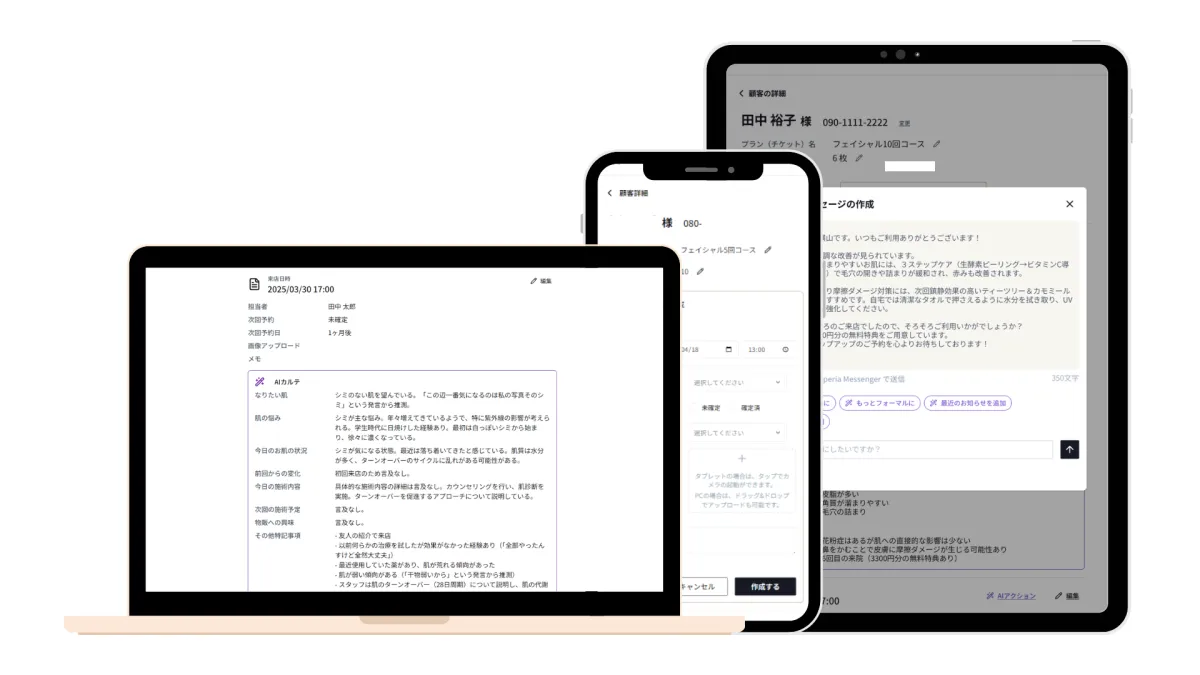 「AIカルテ」は、施術中やカウンセリングの際の会話を自動的に収集・解析し、瞬時に顧客カルテを生成するクラウド型サービスです。具体的には、導入店舗が専用のデバイスで施術中の音声を録音し、PC、タブレット、スマートフォンから専用ダッシュボードにアクセスすることで、カルテの作成だけでなく顧客へのフォローメッセージの送信まで一元管理が可能になります。