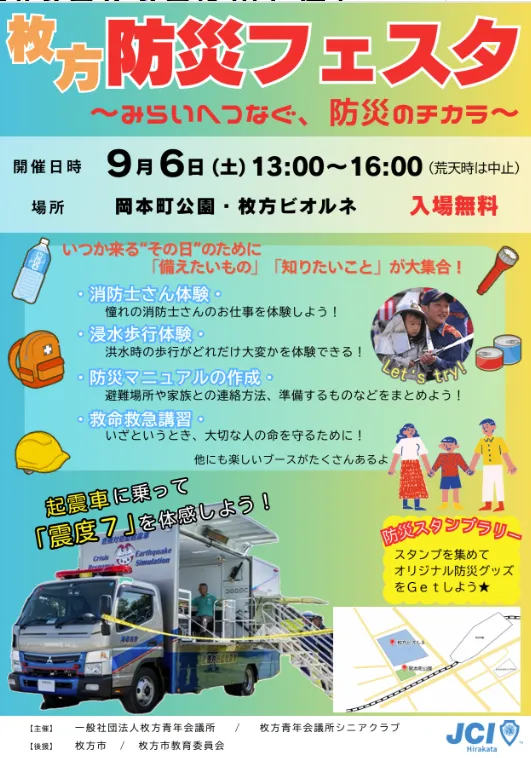一般社団法人枚方青年会議所は、2025年度に向けた新たな取り組みとして、地域の防災意識を高めるための合同公開例会を開催します。日時は2025年9月6日(土)で、時間は13:00から16:00まで。会場は大阪府枚方市の岡本町にある「枚方ビオルネ・岡本町公園」となっています。このイベントは、JCメンバーだけでなく、市民の皆さんにも参加していただける機会です。