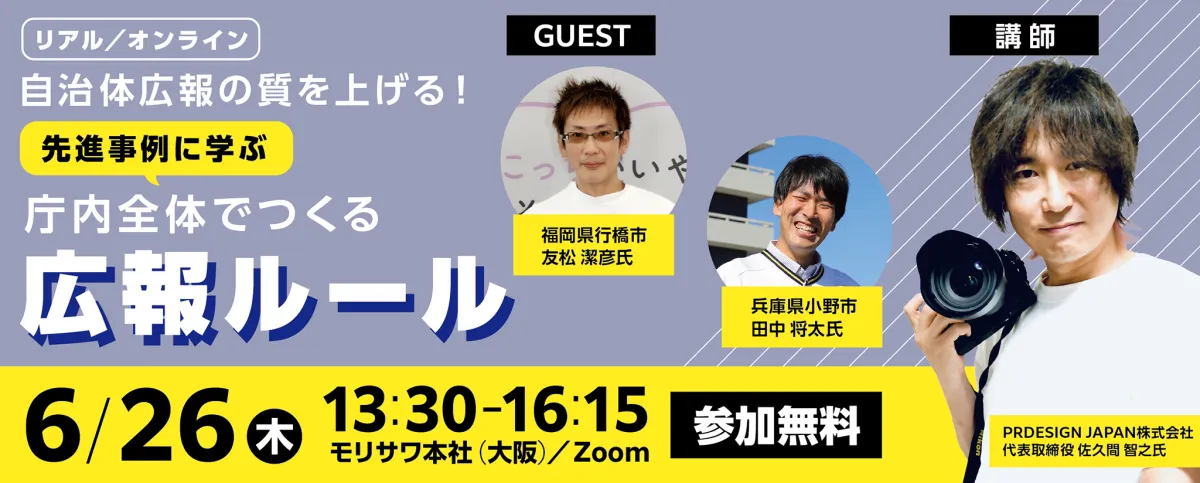 2025年6月26日(木)、株式会社モリサワが主催する無料セミナー「自治体広報の質を上げる!先進事例に学ぶ庁内全体でつくる広報ルール」が大阪で開催されます。このセミナーでは、自治体の広報アドバイザーである佐久間智之氏を招き、広報の基礎からルール作りのノウハウまで幅広いテーマについて学ぶことができます。