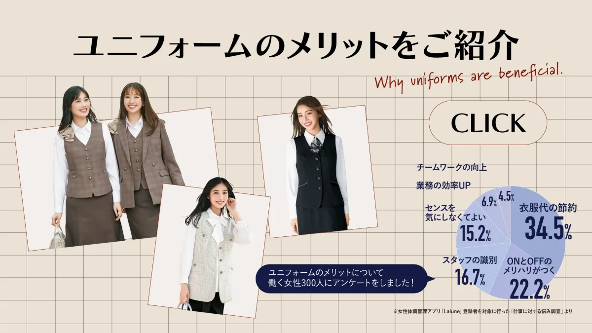 女性向け体調管理アプリ「Lalune」が行ったアンケート調査によると、300人の働く女性がユニフォームに対して好意的な意見を持っていることが分かった。特に「衣服代の節約」「ONとOFFのメリハリがつく」といった声や、「服装のセンスを気にしなくてよい」という意見が多く寄せられた。これにより、ユニフォームの導入は経済的な負担を軽減するだけでなく、精神的なゆとりをもたらすことが明らかとなった。