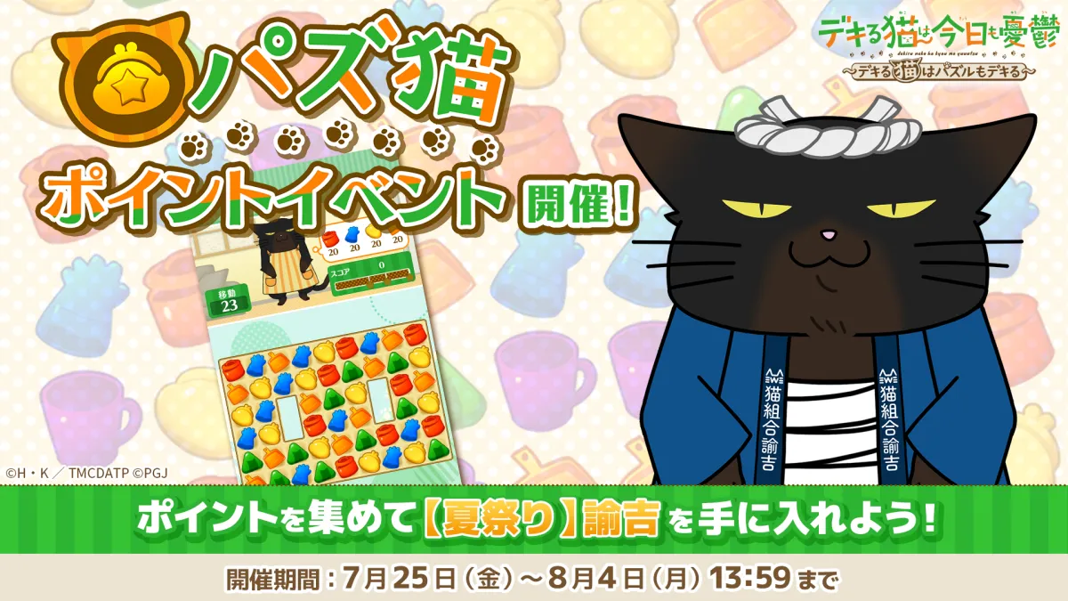 人気テレビアニメ「デキる猫は今日も憂鬱」から新たに登場したスマートフォン向けパズルゲーム『デキる猫は今日も憂鬱〜デキる猫はパズルもデキる〜(略称:パズ猫)』が、様々な報酬が手に入るポイントイベントを開催しています。このイベントは、ポイントを集めることで豪華な報酬を手に入れることができるチャンスとなっており、ファンだけでなく新規プレイヤーも楽しむことができます。