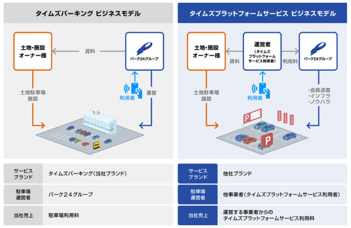 一方、タイムズ24は1991年に日本初の無人時間貸駐車場を開設し、以来全国19,000件以上の「タイムズパーキング」を展開してきました。「タイムズプラットフォームサービス」は、タイムズグループのブランドとして、駐車場やカーシェアリングのノウハウを活かし、効率的な運営を可能にします。