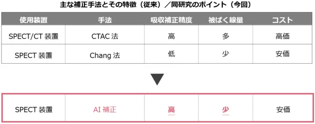 同研究では、吸収補正前のSPECT画像とCTAC法により補正された画像をAIに学習させ、その結果をもとに深層学習モデルを構築します。これにより、従来のSPECT装置でもSPECT/CT装置と同等の精度を実現することが期待されています。このアプローチによって、多くの病院で高精度の画像診断が可能になるとともに、CTによる放射線被ばくのリスクを軽減します。