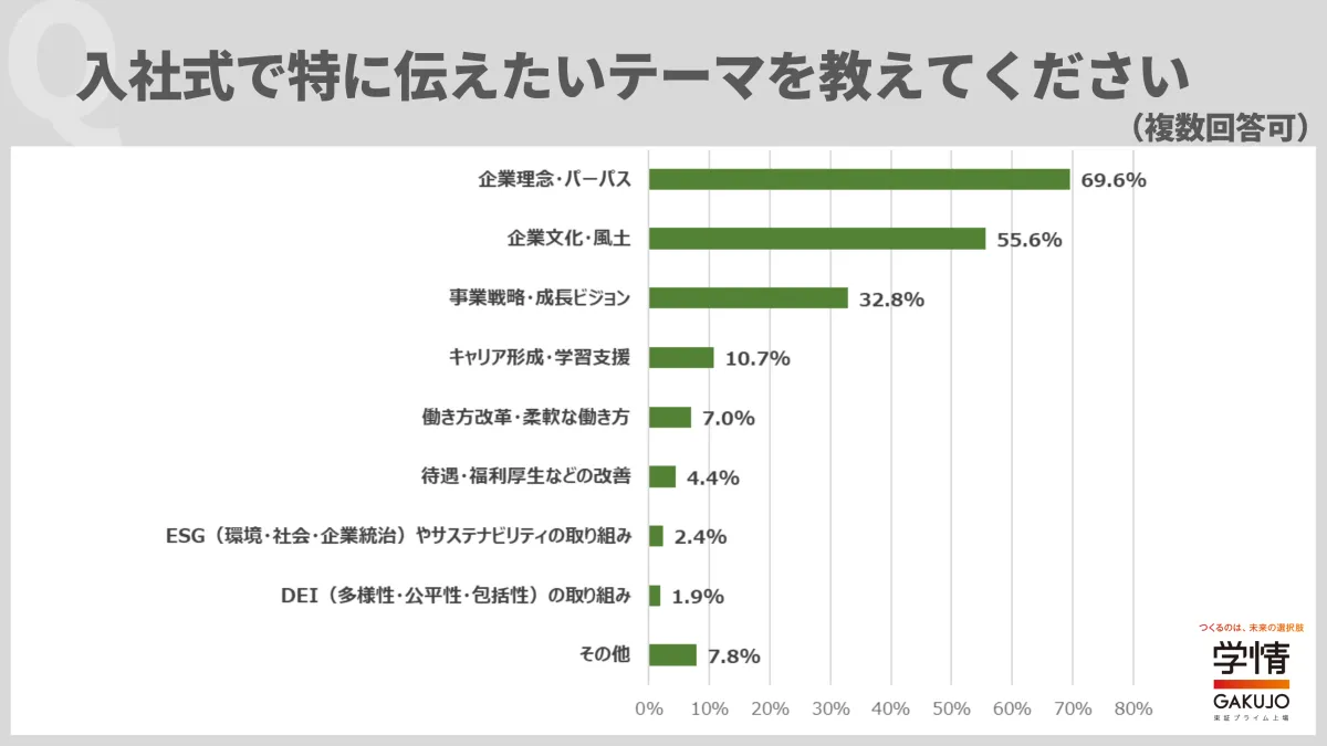 株式会社学情が行った調査によれば、2026年の入社式において特に伝えられるべきテーマは「企業理念・パーパス」で69.6%、続いて「企業文化・風土」が55.6%となっており、依然として新入社員に対する啓発活動の重要性が浮き彫りになっています。
