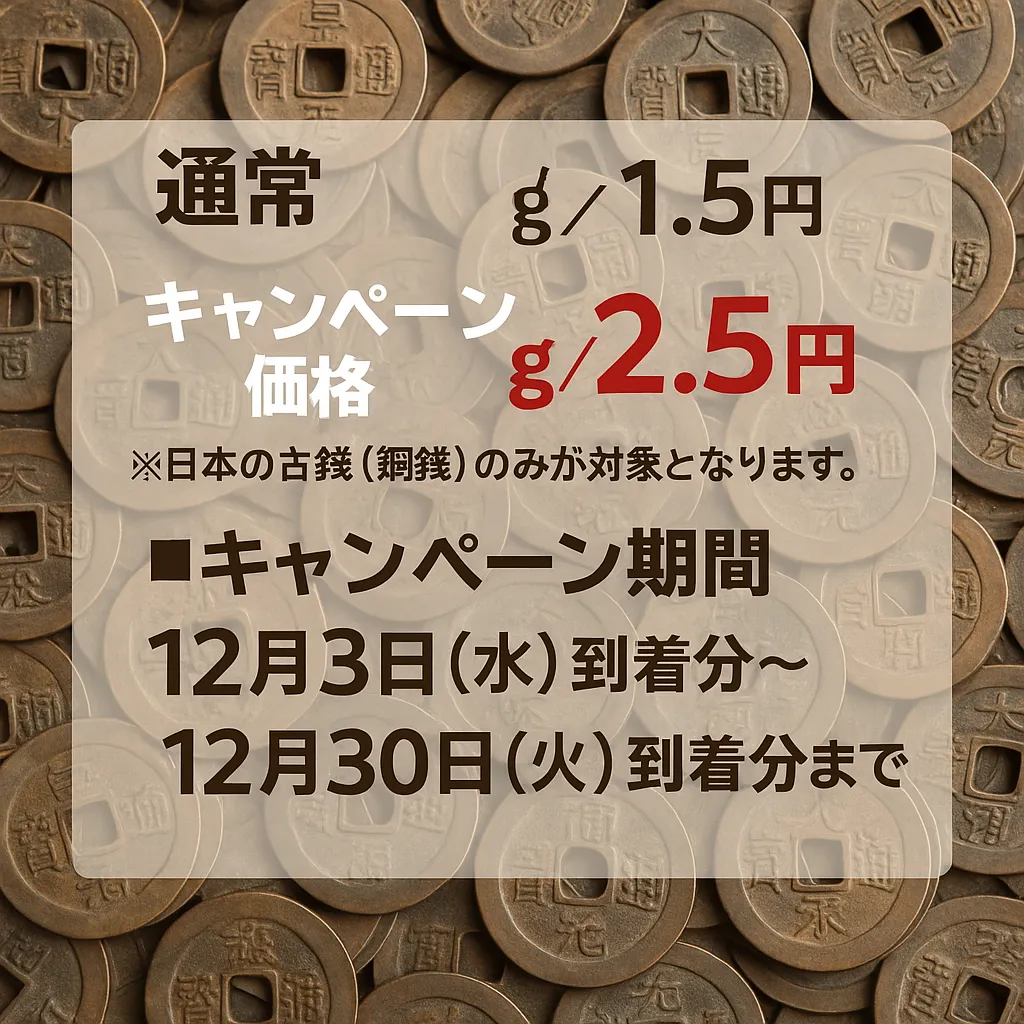 通常の買取価格は1グラムあたり1.5円ですが、キャンペーン中はなんと1グラムあたり2.5円での買取が可能です。この機会に、眠っている古銭を現金に換えられるチャンスをお見逃しなく!