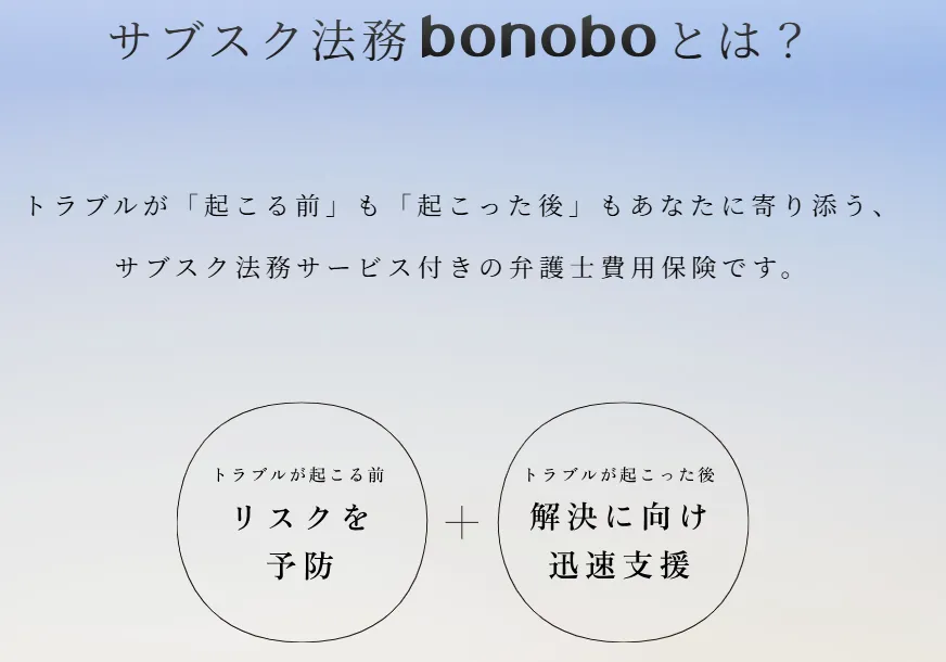 日常のリスク予防:『bonobo』を利用することで、AIによる契約書レビューや法務相談機能を通じて、低コストで日々のリスクを未然に防ぎます。このシステムを利用することで、身近な相談先としての機能も果たします。