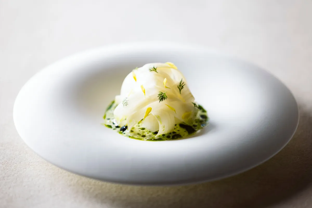 この特別コースの一品目は、鯉とウドの組み合わせです。ウドはスライスされ、瑞々しさを生かしたものとマリネしたものの二種で提供されます。鯉はコリコリとした食感を楽しみながら、スモークによる香りをまとっています。さらに、鯉のコンソメとハーブのソースが、料理全体に深いコクを与え、洗練された味わいを生み出しています。